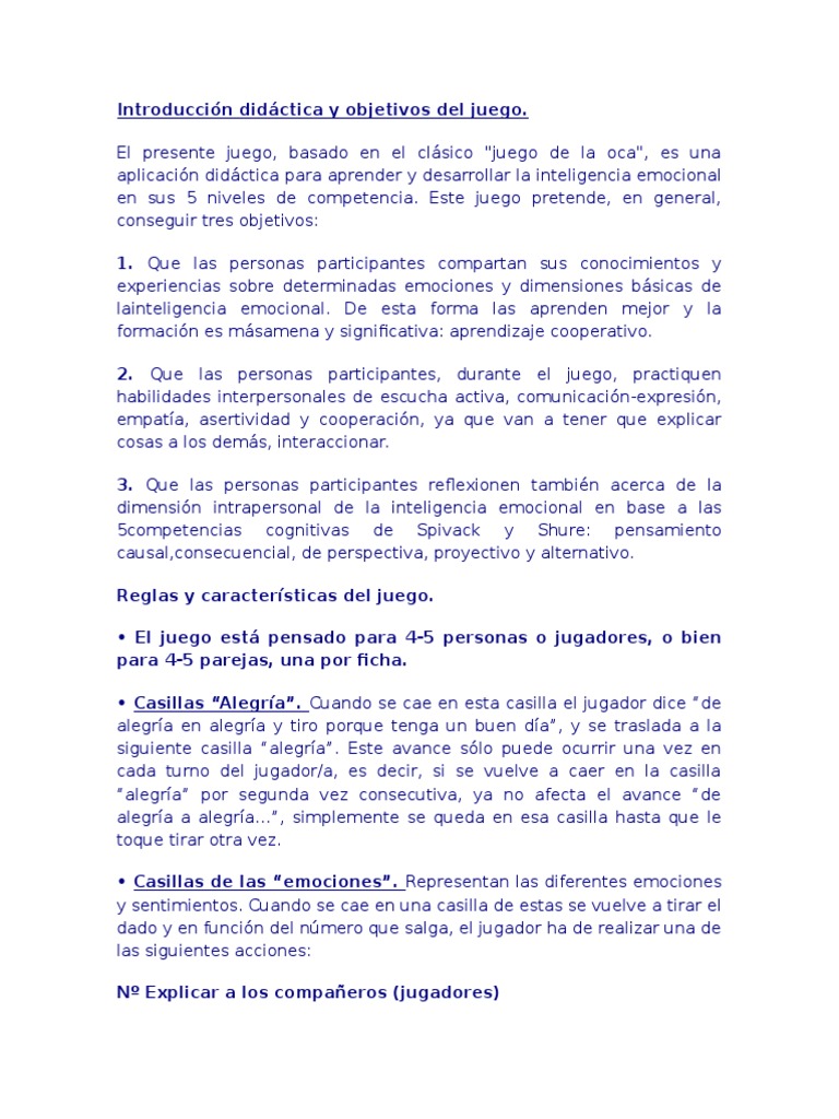 Se recomienda a partir de los 8 años de edad… y hasta un máximo de 99 años. 0 calificaciones0% encontró este documento útil (0 votos). Una de las más habituales es la casilla de la oca, que normalmente la puedes encontrar en las casillas 1, 5, 9, 14, 18, 23, 27, 32, 36, 41, 45, 50, 54, 59 y 63 aunque varía en función del tablero. La oca y sus reglas / dinamica juego de la oca comunicacion interacciones de disciplina academica. Consigue llegar en primer lugar a la casilla 63 siguiendo las instrucciones que irás si cae en alguna de estas casillas debes decir la frase «de oca a oca y tiro porque me toca» automáticamente debe progresar hasta la siguiente. Juego, reglas, origenes y sus relaciones con el camino de santiago y las ocas. 7.2 el acento y sus reglas. Por un orden y unas reglas que son, a su vez, reflejo de las del mundo divino. casillas de oca: Dependiendo de la casilla en la que se caiga se puede avanzar o por el contrario retroceder y en. Juego, reglas, origenes y sus relaciones con el. Cuando se cae en una de estas casillas, se avanza hasta la siguiente oca y, en ocasiones, se vuelve a tirar. Guardarguardar reglas juego de la oca para más tarde. Se trata de un recorrido en espiral que comprende 63 casillas.
